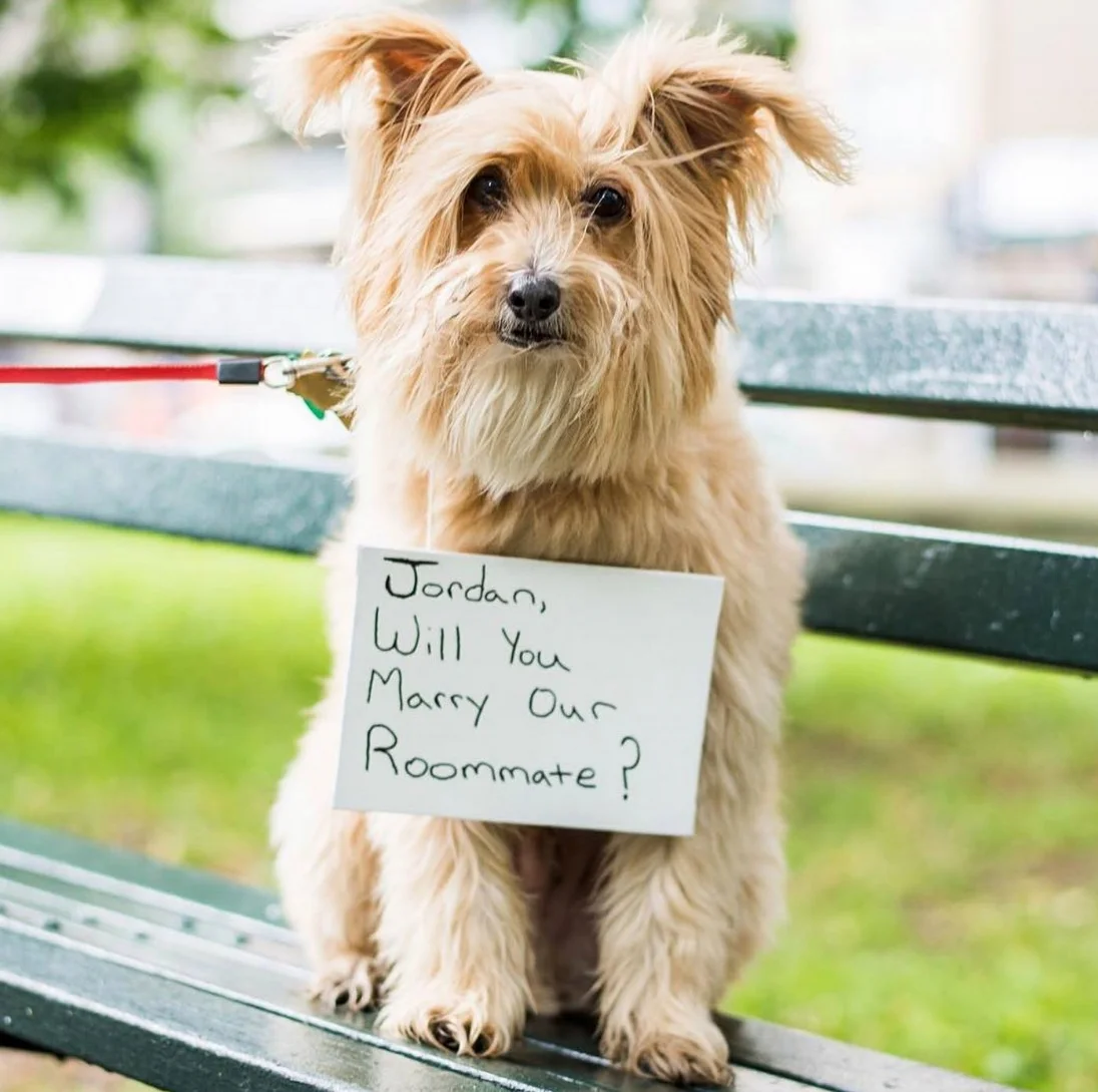 HOW HE ASKED: A few months before we got engaged, Jordan mentioned that it was her dream to get her dog, Oakley, featured on The Dogist. Once Corey heard this, he contacted The Dogist with a “proposal.” He wanted to have Oakley photographed on the bench (wearing a sign) where he first asked Jordan out. Once this was done, he asked The Dogist to post the picture when him and Jordan would be in Central Park a few weeks later. Once the picture was posted and Jordan saw it, Corey got down on one knee in the place where our relationship began. After Jordan said yes, our best friends met us in the park with Oakley so The Dogist could take an “after” picture and celebrate over some champs.